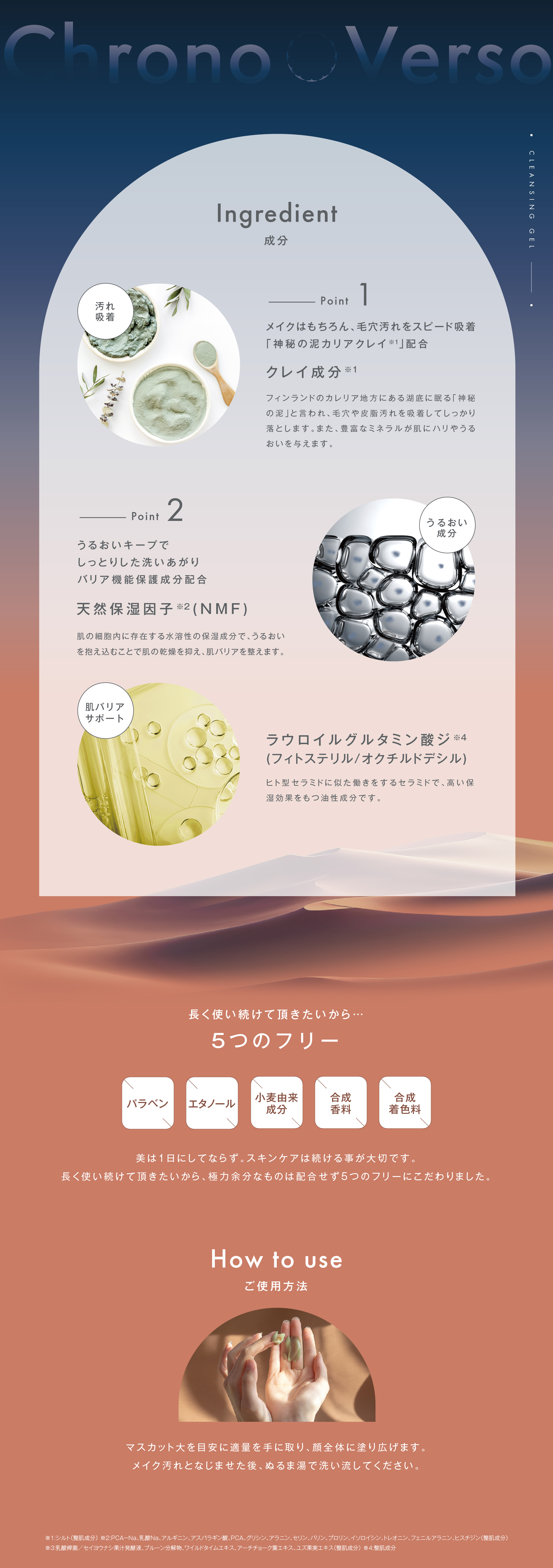 | 特徴 | ミネラルを豊富に含むクレイ成分※1がメイクや皮脂などをしっかりと吸着し汚れを落とすクレンジングジェルです。天然保湿因子※2やセラミド成分※3が肌のうるおいを保ちながらも、毛穴悩みや肌荒れにもアプローチし健やかな肌へ導きます。 ※1:シルト(整肌成分) ※2:PCA-Na、乳酸Na、アルギニン、アスパラギン酸、PCA、グリシン、アラニン、セリン、バリン、プロリン、イソロイシン、トレオニン、フェニルアラニン、ヒスチジン(整肌成分) ※3:ラウロイルグルタミン酸ジ(フィトステリル/オクチルドデシル)(整肌成分) |