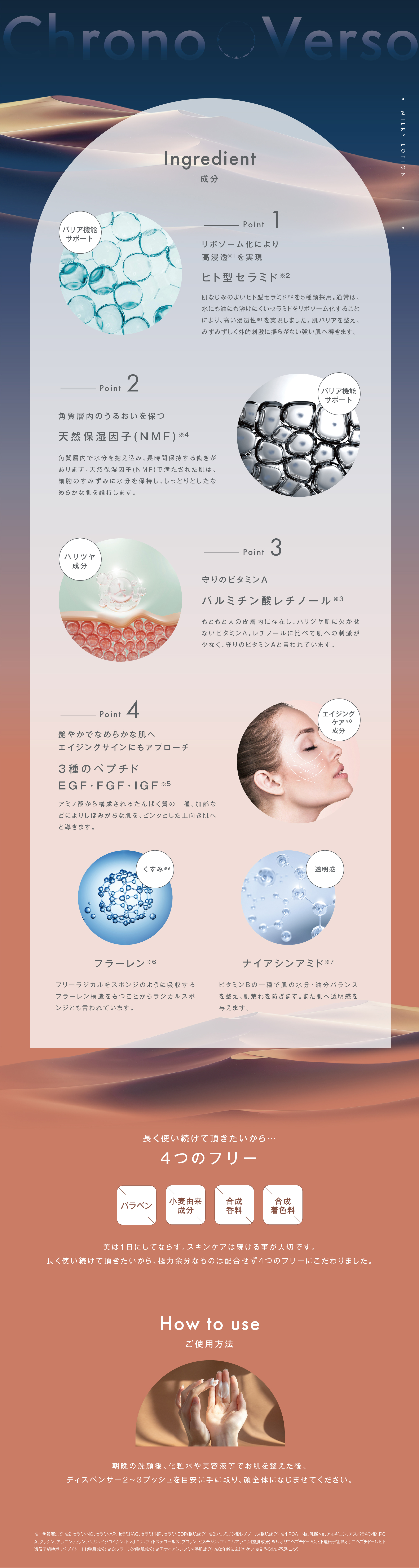 | 特徴 | リポソーム化することで肌への浸透性を高めた※1 5種類のヒト型セラミド※2を配合した守りの美容乳液です。 守りのビタミンAと言われるパルミチン酸レチノール※3 の他、保湿成分の天然保湿因子(NMF ※4)、3種のペプチド(EGF,FGF,IGF)※5~7、フラーレン※8、ナイアシンアミド※9 などの年齢肌には欠かせないエイジングケア成分※10を配合。使いやすいさらりとした使用感でありながら、しっかりとうるおいを閉じ込め、乾燥や外的刺激から肌を守ります。 ※1:角質層まで ※2:セラミドNG、セラミドAP、セラミドAG、セラミドNP、セラミドEOP(整肌成分) ※3:パルミチン酸レチノール(整肌成分) ※4:PCA-Na、乳酸Na、アルギニン、アスパラギン酸、PCA、グリシン、アラニン、セリン、バリン、イソロイシン、トレオニン、フィトステロールズ、プロリン、ヒスチジン、フェニルアラニン(整肌成分) ※5:ヒト遺伝子組換オリゴペプチド-1(整肌成分) ※6:ヒト遺伝子組換ポリペプチド-11(整肌成分) ※7オリゴペプチド-20(整肌成分) ※8フラーレン(整肌成分) ※9:ナイアシンアミド(整肌成分) ※10:年齢に応じたケア |
